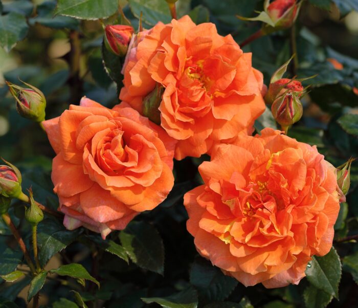 Ce rosier offre une couleur orange cuivrée très lumineuse, rehaussée par un parfum légèrement sucré. Son feuillage vert foncé, ajoute de l’éclat à la floraison.